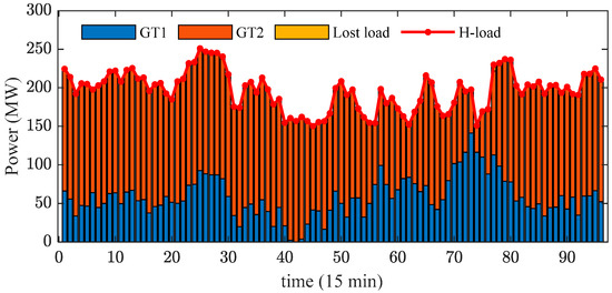 Figure 12 and Figure 13, respectively, depict the power and heat balances during the intraday scheduling phase in Case 4. Although there are discrepancies in the forecast data for WPP, PV, and power/heat loads between the day-ahead and intraday phases, the framework proposed in this study effectively corrects the day-ahead scheduling plans for various flexible resources established during the day-ahead phase. Moreover, the proportion of load shedding in Figure 12 and Figure 13 is minimal, demonstrating the superiority of this framework. It is evident that using the multi-time optimization scheduling framework proposed in this study can effectively prevent inaccuracies in scheduling plans caused by incorrect forecasts of WPP, PV, and different load data. Naturally, for shorter-term scheduling plans, it typically involves adjusting the duration of the schedule and the input forecast data, and so forth.