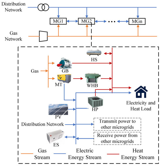 This study focuses on a multi-microgrid system and a distribution network comprising multiple integrated energy microgrids. The structural configuration of the multi-microgrid and the energy flow relationships within the microgrid are illustrated in Figure 1. The multi-microgrid share a common interest and are coordinated uniformly by the dispatching center. The energy sources within the multi-microgrid system include photovoltaic power (PV), distribution networks, and natural gas networks. The energy coupling and conversion equipment in the microgrid consists of a micro-gas turbine (MT), gas boiler (GB), waste heat boiler (WHB), and heat pump (HP). Energy storage devices encompass both energy storage (ES) and heat storage (HS) systems. There exists bidirectional electrical energy interaction among the microgrids. The system integrates the advantages of new energy power generation with traditional fuel power generation, operating on the principle of energy cascade utilization to meet diverse user requirements for electricity and heat. The microgrid procures natural gas and electric energy from the natural gas network and distribution network, supplying energy to both electric and thermal loads via energy conversion coupling equipment within the facility. As the micro-gas turbine generates electricity, the heat contained in the cylinder water and flue gas can be recovered and reused through a waste heat boiler. In instances of insufficient heat supply, electric heating is facilitated through a heat pump. Additionally, the battery and thermal storage tank function as energy storage devices, enhancing the system’s control, and flexibility. To encourage local consumption of the distributed PV, reverse power transmission from the microgrid to the distribution network is excluded from consideration. N represents the number of microgrids under study, with a day divided into T time periods. The mathematical modeling of the aforementioned devices is referred to [8].