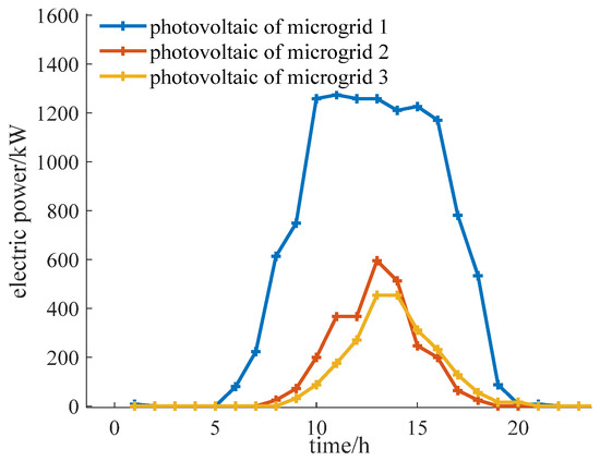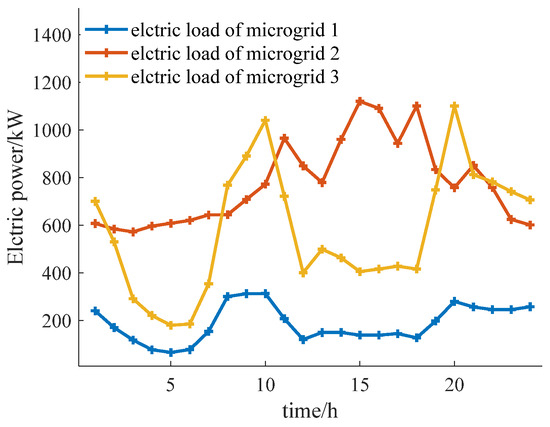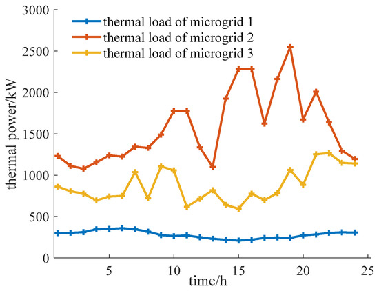 This study considers a multi-microgrid system comprising three distinct microgrids, which are simulated and analyzed based on the proposed model. The analysis divides a day into 24 periods. The user can translate the electrical load, accounting for 20% of the total electrical load, while the maximum allowable translation of the electrical load in each period is capped at 30% of the current electrical load. Additionally, the heat load can be reduced by up to 20% of the total heat load. Each microgrid starts with an initial capacity of 500 kWh for the electrical energy storage device and 1000 kWh for the thermal energy storage device. The time-of-use electricity price and the feed-in price of the distribution network are referenced from [17] and illustrated in Figure 3. The heat price is bounded by an upper limit of 0.50 yuan/kWh and a lower limit of 0.15 yuan/kWh. Furthermore, the upper limit for the average selling price of power is set at 0.8 yuan/kWh, while the upper limit for the average selling price of heat is 0.45 yuan/kWh. The maximum power exchange between microgrids is restricted to 500 kW/h, and the maximum power purchase from microgrids to the distribution network is limited to 1000 kW/h. The user’s energy consumption preference coefficients are 1.8, 1.4, 0.0006, and 0.0005, respectively. The cost associated with unit photovoltaic curtailment is 0.5 yuan/kWh. For the purposes of this analysis, energy transmission losses are disregarded. The electrical heating load curve and photovoltaic output for each microgrid are presented in Figure 3, Figure 4 and Figure 5, while the parameters for the MT, WHB, GB, and other devices in each microgrid are detailed in Table 1.
