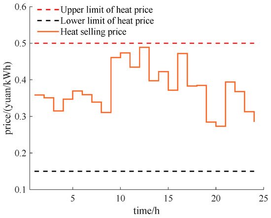 The pricing strategy of the multi-microgrid system is based on the consideration of the users’ load demand. The heat sale price and electricity sale price formulated by the multi-microgrid system are and , respectively. The on-grid price and the time-share price are and , respectively. The upper and lower limits of the heat sale price are and , respectively. The average price ceiling of the power sale and heat sale price is and , respectively. The energy sale price must meet the following constraints: