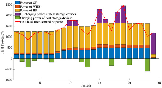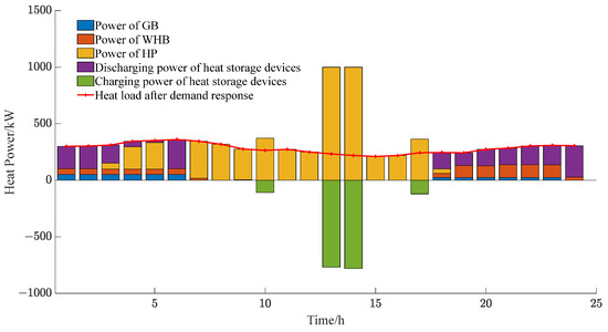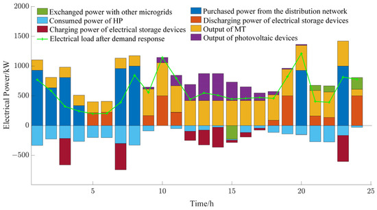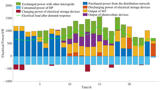The optimization results of the electrical power balance for each microgrid within the multi-microgrid system are presented in Figure 8, Figure 9 and Figure 10, and the optimization results for the thermal power balance are presented in Figure 11, Figure 12 and Figure 13.