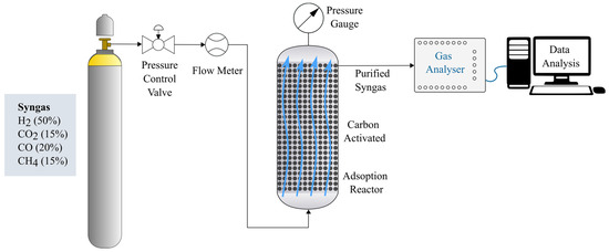 Adsorption experiments using activated carbon were performed in a cylindrical PVC fixed-bed reactor with dimensions of 34 cm in height and 6.35 cm in diameter. The reactor was loaded with either 0.129 ± 0.021 kg of GAC or 0.228 ± 0.014 kg of PAC and fed with synthetic syngas. The syngas composition consisted of 50% hydrogen, 15% carbon dioxide, 20% carbon monoxide, and 15% methane. This gas composition was selected based on findings from a previous investigation conducted by the authors, which analyzed the typical syngas produced during the glycerol reforming process [22].