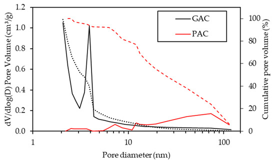 From the pore size distribution, which shows the distribution ranged from 2 nm to 119 nm, i.e., the mesoporous range and part of the macroporous range (Figure 4), the mesopore content with respect to the macropore content for PAC is in the order of 8% and 92%, respectively. On the contrary, in GAC, the percentage of mesopores represents 86% (appreciating an important access size diameter at 3.9 nm) compared to 14% of macropores. Therefore, the importance of the mesoporous in this activated carbon is greater than in PAC. Furthermore, in GAC there is a marked peak at the beginning of the graph indicating that there is an important volume below 2 nm, a range from which the contribution of micropores begins.