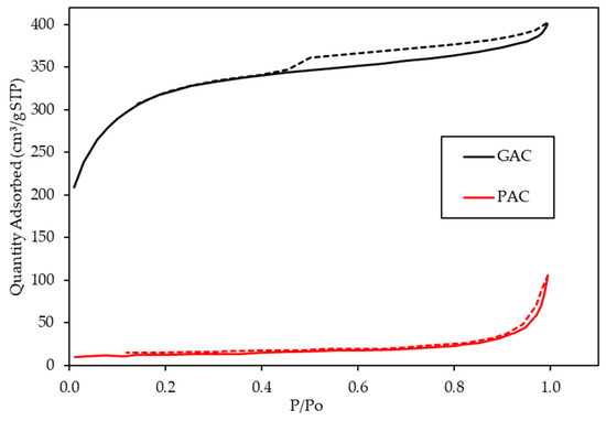 With respect to the nitrogen adsorption–desorption isotherms (see Figure 5), GAC can adsorb a greater amount of N2 than PAC. The adsorption curve of GAC carbon corresponds to the type IV isotherm characteristic of mesoporous solids since it presents a hysteresis cycle, which is associated with the capillary condensation characteristic of adsorption/desorption in mesopores. Its hysteresis cycle is H4, which corresponds to limited amounts of mesopores bounded by micropores [43]. This fact could be seen in the SEM images.
