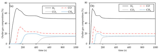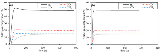 For pelletized activated carbon (PAC) (Figure 8), the breakthrough time was nearly constant, with 22 s at 0.5 L/min (Figure 8a) and 15 s at 1 L/min (Figure 8b), suggesting that the pelletized form may have a reduced capacity to adsorb gases effectively under different flow conditions, possibly due to its lower surface area and pore accessibility. For example, Nguyen et al. [56] found that pelletized activated carbon-based materials may exhibit reduced gas adsorption capacity under varying flow conditions due to oxidation stability and resistance to aggregation. In the case of saturation times, a similar trend was observed, with breakthrough times of 776 s at 0.5 L/min and 573 s at 1 L/min, indicating that lower feed rates allow for more extended adsorption periods before saturation occurs.