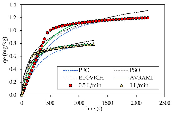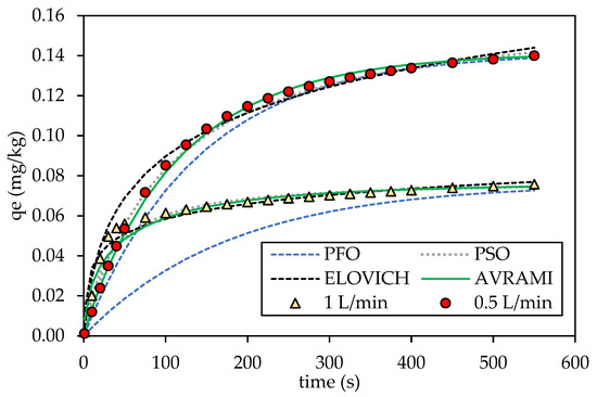 where qe and qt are the amount of adsorbate adsorbed at time t and at equilibrium (mg/kg), k1 is the rate constant of the first-order adsorption (s−1), k2 is the rate constant of the second-order adsorption (kg/mg·s), α represents the initial adsorption rate (mg/kg·s), and β relates the covered surface to the activation energy for chemical adsorption (kg/mg), kA is the rate constant of the Avrami model (L/mg·s), and nA is the Avrami exponent.