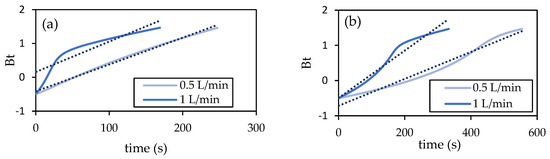 The plot of Bt versus time for both GAC and PAC adsorbents at varying gas flow rates, as shown in Figure 11, illustrates different adsorption behaviors. At a gas flow rate of 1 L/min, the plots show significant deviations from linearity, indicating non-ideal behavior. However, at lower flow rates (0.5 L/min), the adsorption process exhibits a more linear trend, although the plot does not pass through the origin (Table 6). This suggests that at lower flow rates, the adsorption process is closer to ideal conditions, potentially due to the increased contact time between the gas and adsorbent, allowing for more complete diffusion. Despite the linearity observed at lower flow rates, the fact that the plots do not pass through the origin implies that intraparticle diffusion is not the sole rate-controlling step, consistent with the Boyd diffusion model’s conclusion that film diffusion is not the dominant mechanism [29]. The findings are in agreement with Rashidi et al. [67], who evaluated the mechanism of CO2 adsorption on activated carbon and found non-linear fittings, concluding that more than one process affected the CO2 adsorption.
