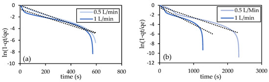 Breakthrough curves of PAC at different gas flow rates: (a) 0.5 L/min; (b) 1 L/min.