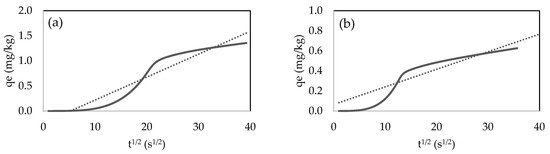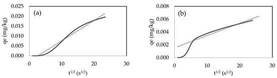 where kWM represents the intraparticle rate constant (mg/kg·s0.5), and C is a constant that allows for determining the thickness of the fluid film surrounding the adsorbent surface (mg/kg). When plotting the adsorbed amount versus the square root of time, a linear relationship in the Weber–Morris plot suggests intraparticle diffusion control.