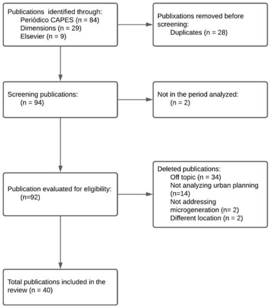 Thereby, articles that were not directly related to the topics of the defined research domains were excluded. As a result of the effort, when applying the exclusion criteria of the eligibility stage of the 92 publications, 40 publications deal particularly with urban planning and microgeneration of renewable energy (Figure 2).