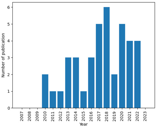 The number of publications in relation to the year, represented by Figure 3, demonstrates that, even considering the beginning of the time interval in 1997, it was only in 2007 that the first publication on the topic occurred.