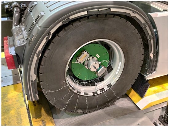 The tyres were maintained at the measurement temperature for a minimum of 10 h before the measurements began. Additionally, to isolate the rolling resistance from the losses in the gearbox and differential, the brake pads and drive shafts were disassembled from the rear axle. Furthermore, the air bellows were replaced with steel bars to eliminate variables influencing the axle load. During the tests, the drive axle was loaded with hydraulic cylinders that pull the vehicle to the drums. The total axle load for the drive axle was 10,400 kg.