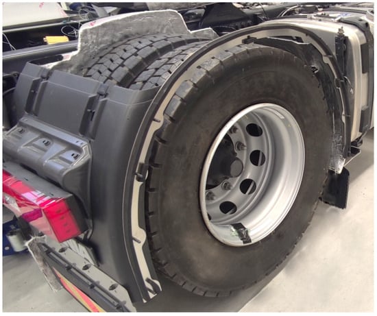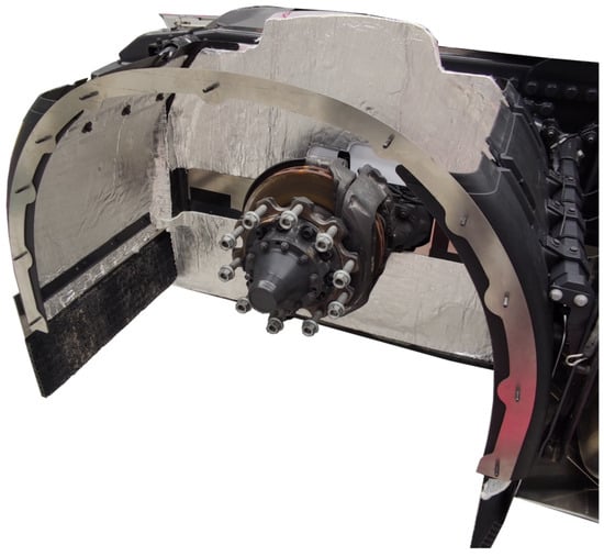 The encapsulation of the wheels reduces the relative velocity between the tyre and the surrounding airflow, which should cause a decrease in forced convection. The wheelhouse was modified so that the inner side of the wheelhouse was encapsulated nearly down to the ground. The lower part was attached to the axle, and the upper part to the frame. This way, the wheelhouse allows suspension movements during driving. The part closest to the ground is made of a flexible rubber mat that allows intermittent contact with obstacles during driving. Additionally, the wheelhouse is insulated using an aluminium glass fibre composite, as shown in Figure 4. Using a reflective insulation material reduces radiative heat losses from the wheelhouse to the surroundings. Figure 5 shows the wheelhouse with a closed wheelhouse setup. With the open wheelhouse (Figure 6), the white cover shown in Figure 5 was removed along with the wheelhouse top. Semi-trailer trucks often drive without the top covers, which is why this was chosen to be the open setup. Otherwise, the tests were identical.
