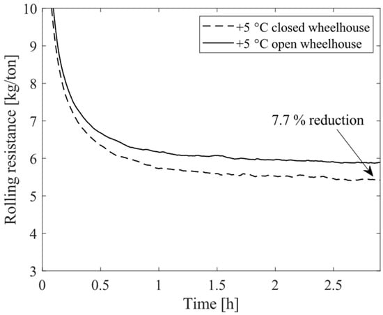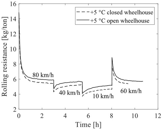 Rolling resistance measured at 80 km/h with closed and open wheelhouse setups.