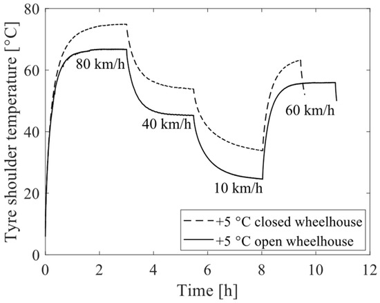 - The tyre temperature with a closed wheelhouse at an ambient temperature of −30 °C was higher than the tyre temperature with an open wheelhouse at −10 °C. This indicates that rolling resistance at −30 °C could be lower with a closed wheelhouse compared to an open wheelhouse at a significantly higher ambient temperature.