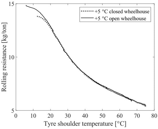 Rolling resistance as a function of tyre shoulder temperature at an 80 km/h speed level with closed and open wheelhouse configurations.