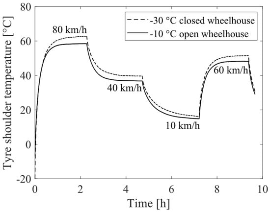Tyre temperature with open wheelhouse at −10 °C and closed wheelhouse at −30 °C.