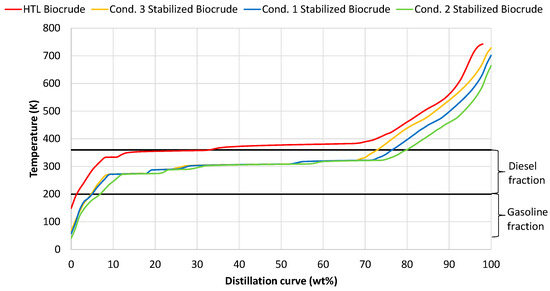 Distillation curves from raw HTL biocrude and from the stabilized products from conditions 1, 2 and 3.