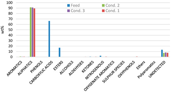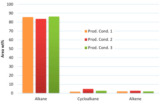 On the other hand, the stabilized products after the mild hydrotreatment step consists mainly of aliphatic hydrocarbons by >90 wt%. Aliphatic hydrocarbons are hydrocarbons based on chains of carbon atoms. More specifically, the product from condition 1 consists of 85.65 wt% alkanes, 1.74 wt% cycloalkane and 2.05 wt% alkene, the product from condition 2 consist of 83.68 wt% alkane, 4.84 wt% cycloalkane and 2.78 wt% alkene, while the product of condition 3 consists of 86.27 wt% alkane, 2.77 wt% cycloalkane and 2.09 wt% alkene as presented in Figure 4. These results show the efficiency of the hydrotreatment to transform the heavy carboxylic acids that have carbon atoms bonded to oxygen atoms by a double bond and to hydroxyl groups by a single bond to the corresponding aliphatic hydrocarbons, which are organic molecules without carbon–carbon double or triple bonds (alkane and cycloalkane). Kohansal et al. [11] also noticed the formation of alkanes, such as hexa- and octadecanes, after the hydrotreatment of biocrude from municipal solid wastes.
