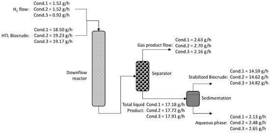 On the first step of the current study, the mild upgrading of an HTL biocrude was investigated via hydrotreatment, targeting to stabilize the biocrude. During the current step, the effect of the hydrotreatment operating conditions on product quality and process performance was explored. To that purpose, three conditions were tested, targeting to examine two different hydrotreating temperatures (603 K and 633 K) and two hydrogen-to-oil ratios (3000 scfb and 5000 scfb). The experimental protocol is presented in Table 2. The operating window was selected based on a detailed literature screening on pyrolysis bio-oil and HTL biocrude hydrotreatment [18,33,34,35,36,37,38,39,40,41,42]. The first and second conditions lasted three days on stream (DOS) each, while the third condition lasted 2 days on stream due to the limited feedstock availability. Daily liquid samples were collected in order to measure the density and sulfur content, while, on the sample of the last day of each condition, more analyses were performed, including the mass balance and hydrogen consumption calculations. All conditions were explored via one dedicative run that had a total duration of 8 consecutive days.