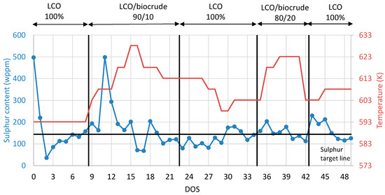 The operating window for co-hydroprocessing is the same with the operation of a typical refinery, which is the product potential end-user [32]. The parameters of pressure, LHSV and H2/oil ratio remained constant, while the reactor temperature was gradually increased during the experiment (593–663 K) in order to keep steady the sulfur content of the products. The aim was to investigate how the 10% and 20% v/v of the stabilized biocrude integration influence the HDS activity of the catalyst during hydrotreatment of LCO. The stabilized biocrude insertion in LCO negatively influences the catalyst HDS efficiency. In order to counterbalance this negative influence, the temperature was gradually increased to maintain the product sulfur content at constant levels, similar to that of the reference case with neat LCO. Finally, during the coprocessing experiment, the reactor pressure was kept constant at 6.9 MPa, LHSV at 1 h−1 and H2/liquid feed ratio at 3000 scfb.
