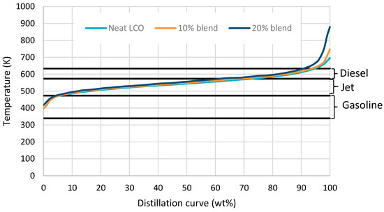 Product distillation curve from neat LCO, 10% and 20% v/v blend with stabilized biocrude.