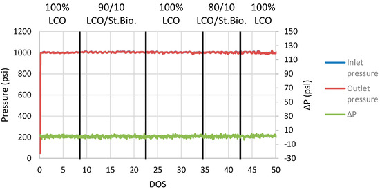 ΔP plot during coprocessing of LCO and stabilized biocrude blends.