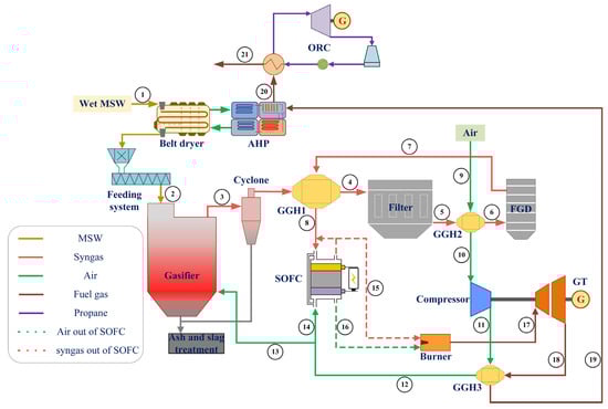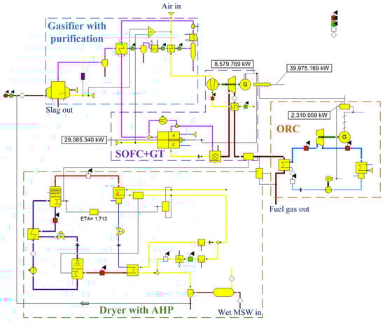 The following supporting information can be downloaded at: https://www.mdpi.com/article/10.3390/en17236034/s1, Table S1: Details of the main components in EBSILON Professional; Figure S1: Diagram of the drying system coupling with AHP; Figure S2: Simulation model for the MSW gasifier with clarification; Figure S3: Simulation model for the SOFC and GT; Figure S4: Simulation model for the MSW dryer with AHP; Figure S5: Simulation model for the ORC.