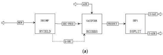 In the EBSILON Professional software, there is no specific model for direct contact drying, like belt drying. In this study, the tank and separation modules were used to simulate the drying process. To verify the accuracy, the drying process model in ASPEN PLUS referred to in some studies was also used [47,48], and the model is included in Figure 4. There was almost no deviation in hot air flow rate for different moisture contents of dry MSW, except for a deviation of about 2.6% when the moisture content of dry MSW was zero. Hence, the feasibility of simulating the drying process using EBSILON Professional in this study was acknowledged.