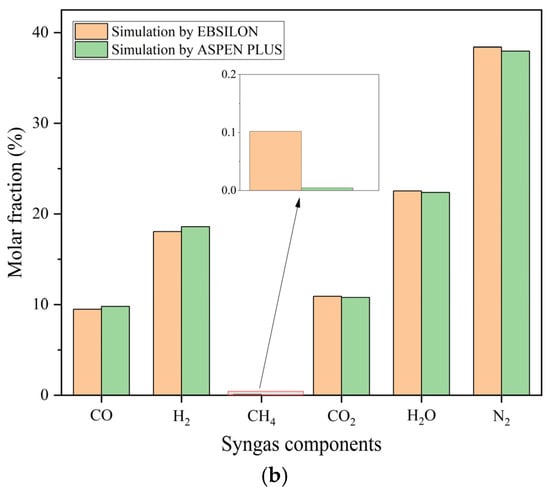 The proposed integrated system in this study was still in the preliminary research and design stage. The reliability of the models in this study was assessed through the accuracy of each subsystem or cycle. For the gasification process, there have been many studies using ASPEN PLUS for simulation based on Gibbs free energy minimization, and its high reliability has been proven. Therefore, the simulations conducted using the EBSILON platform in this paper were compared with those based on ASPEN PLUS found in the literature [44,45,46]. The RYield and RGibbs modules were employed with the property methods of PR-BM in ASPEN PLUS V12. As illustrated in Figure 3, the syngas composition resulting from raw MSW gasification was similar, indicating that the simulation using the EBSILON platform was accurate. The observed differences may be attributed to the gasification module in EBSILON converging based on the degree of the water–gas conversion reaction rather than the Gibbs free energy minimization [17].