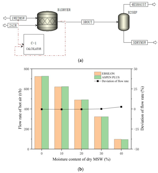 Simulation of MSW drying process for verification by ASPEN PLUS: (a) model of MSW drying by ASPEN PLUS; (b) verification of drying process.