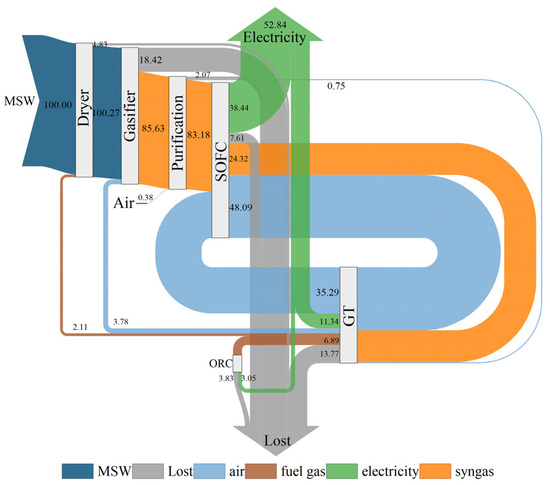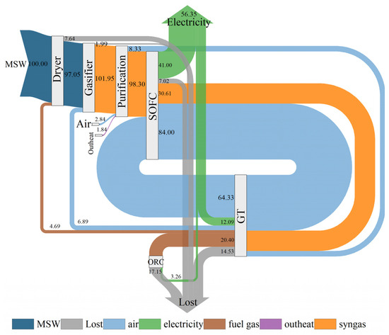 When the moisture content of dry MSW was 20.0%, the total power generation reached 39,975.17 kW. The power generations of the SOFC, GT, and ORC were 29,085.34, 8579.77, and 2310.06 kW in sequence, indicating that the SOFC made the most significant contribution. This is similar to the results of previous studies. For instance, the research of Wu et al. [9] showed that the SOFC contributed 71% to the total power generation of the system. Figure 5 displays the energy flow analysis of the proposed integrated system based on the LHV of raw MSW. The energy loss was notably greater for the GT and ORC processes compared to the others. This observation could be attributed to the superior power generation efficiency of the SOFC in relation to the GT and ORC [10]. It took a lot of energy from syngas and air to get the SOFC running properly. The temperature rise for discharged air from the SOFC cathode resulted in a significant increase in its energy. In the case of the GT, most of the energy was used to compress and heat the air, specifically to drive the air compressor. The low power generation and significant energy loss indicated a relatively low energy efficiency for the ORC. Figure 6 illustrates the exergy flow analysis based on the exergy value of raw MSW. Unlike the energy flow, the most significant exergy loss occurred during the gasification process, which aligned with findings from several studies [8,9]. This substantial exergy loss could be attributed to the fact that gasification is an irreversible process that transforms low-entropy solid fuel into high-entropy syngas [8]. Yang et al. [16] investigated the energy and exergy characteristics of a system including biomass co-gasification, an SOFC, and an ORC. The results also showed that the highest exergy losses occurred in the gasifier and SOFC. The exergy loss of the GT was also very considerable. However, the exergy flow to the ORC was limited, and the exergy efficiency was higher than its energy efficiency. This was mainly caused by the low energy grade of fuel gas into the ORC due to its low temperature.