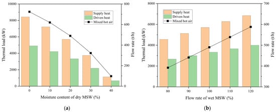 The impact of MSW drying degree on the gasification and power generation was investigated emphatically. The influence of the moisture content of dry MSW on the heat load during the heat pump drying process is illustrated in Figure 7a. It is evident that the driven heat load and flow rate of mixed hot air increased noticeably with the decrease in moisture content. As shown in Figure S1, the driven heat source was the flue gas out of the GT. The mixed hot air, which was heated by the absorber and condenser of the AHP, was employed to dry the MSW. Figure 7b indicates that the change in the above parameters was nearly linear with respect to the flow rate of wet MSW. Clearly, the reduction in evaporated water during the drying process contributed to these results.