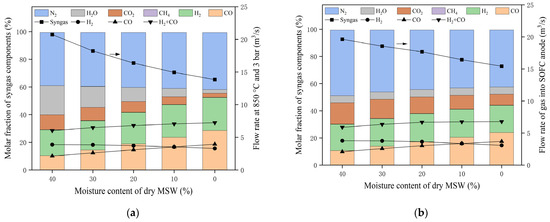 - During gasification, the molar fraction of CO and H2 decreased with the increase in moisture content of the dry MSW, while the molar fraction of H2O and CO2 exhibited a notable increase. However, the flow rate of H2 slightly increased resulting from the strengthened water–gas shift reaction with a higher fraction of H2O.