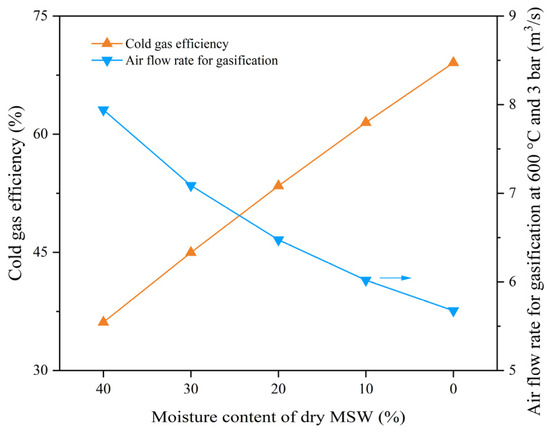 The influence of moisture content of dry MSW on cold gas efficiency and air flow rate.