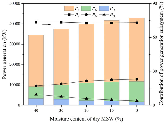 Figure 10 includes the impact of MSW drying degree on the power generation of the proposed integrated system. The total power generation increased from 34,469.50 to 42,967.03 kW as the moisture content decreased from 40.0% to zero. The influence of moisture on power generation aligns with the findings of previous studies [15,37]. Xu et al. [37] believed that the drying process enhanced the energy grade of raw materials. For this study, the low-grade heat energy of flue gas was converted into the high-grade energy of dry MSW by the heat pump drying system. In the heat pump drying process, the total pressure drop in air for drying was assumed to be 80 kPa, and the isentropic efficiency of the air compressor was 0.85. When the moisture content of dry MSW was zero, the motor power was up to 2103.03 kW. In consideration of the very small power consumption of the solution pump in the AHP, the system still demonstrated a considerable increase in total power generation.