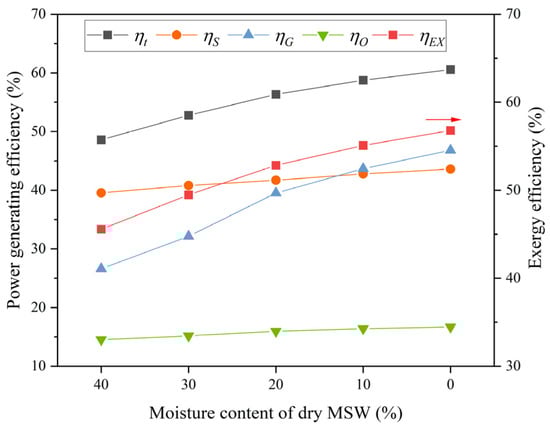 - The total power generation increased from 34,469.50 to 42,967.03 kW when the moisture content of dry MSW decreased from 40.0% to zero. The impact of moisture content on the power generations of the SOFC, GT, and ORC varied. For the SOFC and GT, the lower moisture resulted in a higher power generation. The change law was reversed for the ORC. The total power generation efficiency increased with the reduction in moisture content, as did the efficiency of the SOFC, GT, and ORC. Through energy efficiency and exergy efficiency analyses, it was clearly shown that MSW drying with the AHP was beneficial to the gasification and power generation system.