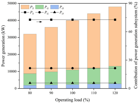 Figure 11 demonstrates how the MSW drying degree affected power generation efficiency. The total power generation efficiency increased with the reduction in moisture content, as did the efficiency of the SOFC, GT, and ORC. Nevertheless, the increase in efficiency for the GT was notably more pronounced. Table 8 shows some parameters and power changes related to the GT. The work generated by the GT for the air compressor decreased as the moisture content was reduced. Simultaneously, the work generation efficiency of the GT was almost unchanged. This phenomenon could be attributed to the significantly reduced temperature of air entering the compressor, leading to the decreased volume flow rate. A lower volume flow rate would necessitate less mechanical work. As previously mentioned, this also accounted for the observed increase in the power generation of the GT. The efficiency of the ORC was relatively low, which is consistent with the characteristics of the ORC [50,57]. The ORC had a low boiling point for organic matter, as the working medium was mainly composed of the evaporator, turbine, condenser, and working medium pump/compressor. The condensation of the working medium in the condenser released a significant amount of latent heat. Besides, the temperature of the heat source that heated the evaporator was usually relatively low. These factors contributed to the low energy efficiency of the ORC system. Furthermore, the overall exergy efficiency of the system was enhanced as the moisture content decreased, indicating an improvement in useful work and a reduction in reversible losses. In addition, the influence of operating load on the power generation was investigated when the moisture content of dry MSW was fixed at 20.0%, and the results are shown in Figure 12. With the increase in operating load, the total power generation increased. The power generation of each subsystem increased simultaneously, while their contributions to the total power generation remained unchanged. This may account for the process stability and variable load capacity of this theoretical system. Of course, further research is needed on the design of specific heat transfer equipment, analysis of power consumption in the plant, and experiments related to gasification and power generation equipment.