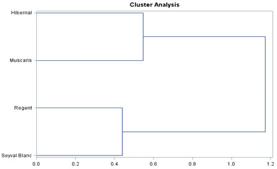 The cluster analysis presented in the dendrogram illustrates the classification of PIWI varieties based on stalk mass for ‘Hibernal’, ‘Muscaris’, ‘Regent’, and ‘Seyval Blanc’. The dendrogram identified two main clusters, providing insights into the differences in stalk mass among the individual varieties (Figure 1).