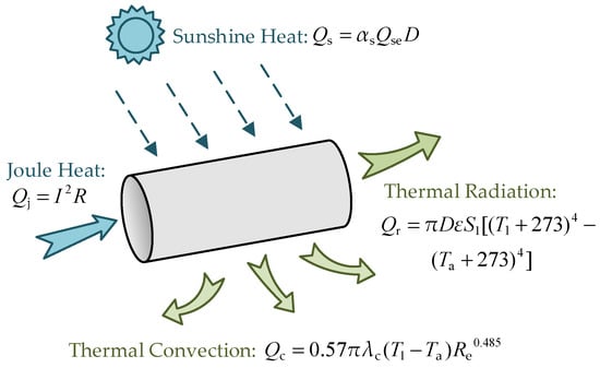 Among these factors, the joule heat (Qj) generated by the wire itself and the heat absorbed from sunlight (Qs) stand out as the primary contributors to its temperature increase. Meanwhile, the thermal convection (Qc) due to wind and thermal radiation (Qr) resulting from the temperature difference between the wire and the environment play a dominant role in reducing the line temperature.