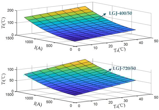 Take AC transmission lines as an example: Equation (1) and these provided meteorological parameters surrounding the conductor are utilized. The results, illustrating the thermal equilibrium achieved under varying wire currents (I) and ambient temperature (Ta), are presented in Figure 2.