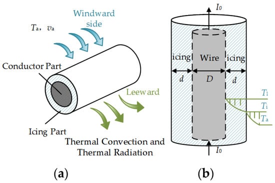 Schematic diagram of conductor icing heat balance. (a) Heat transfer process; (b) temperature layer distribution.