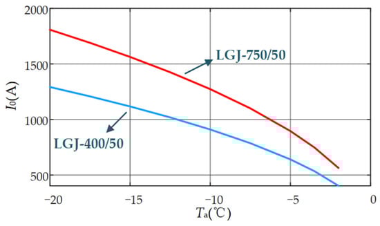 In extremely cold weather conditions, when the conductor current is at or below the critical ice melting current I0, the joule heat generated by the conductor is not sufficient to melt the ice. However, it is noteworthy that if the conductor’s temperature is maintained at 0 °C and the current always exceeds the critical ice melting current, the overhead conductor will remain ice-free. Consequently, the conductor exchanges heat with the surrounding air, and its heat balance relationship is governed by Equation (1). Therefore, the temperature of the overhead conductor in extreme cold weather can be calculated as follows: