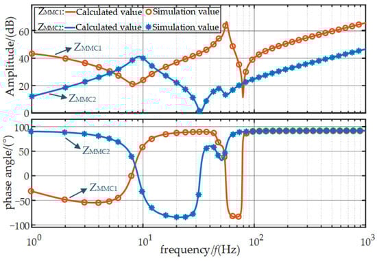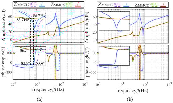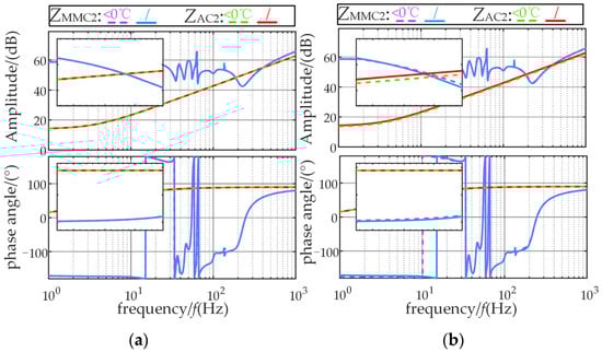 From Figure 20, it is evident that under extremely low-temperature conditions, the positive sequence impedance of both MMC2 and AC2 is marginally lower than the theoretical value. Consequently, the resonant point of MMC2’s impedance increases in magnitude, while its amplitude and phase remain unaffected. This particular scenario enhances the stability of the anti-system.