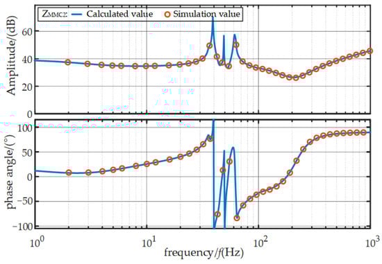 Figure 12 and Figure 13 illustrate the zero-sequence impedance of a terminal-ended MMC under variations in DC line impedance. Specifically, Figure 13 compares the amplitude and phase of the ideal impedance with the actual impedance on the DC side of the two-terminal MMC. It is clear that the DC line impedance is primarily associated with the rectifier side, while the MMC2 DC-side impedance remains unaffected.