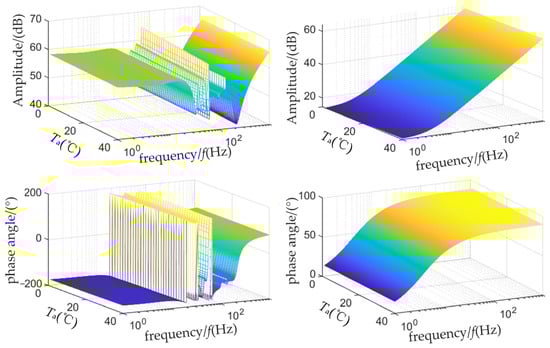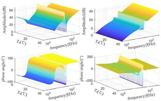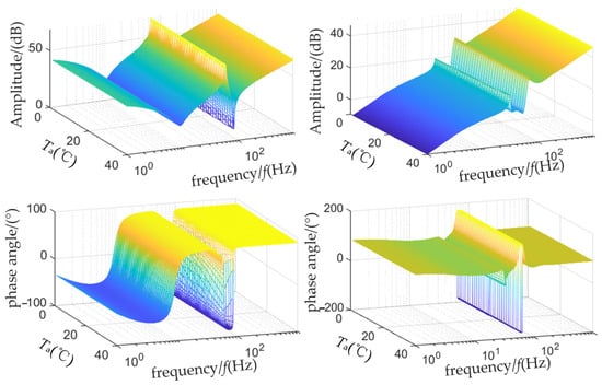 Figure 10 and Figure 11 exhibit the amplitude and phase waveforms of the terminal-end MMC’s DC-side impedance under AC line impedance variation. Figure 11 offers a comparative analysis between the ideal impedance and the actual impedance at the MMC DC side. As the ambient temperature increases from 10 °C to 40 °C, the impact on the impedance of the two-terminal MMC is minimal, leaving the DC side stability of the system undisturbed.