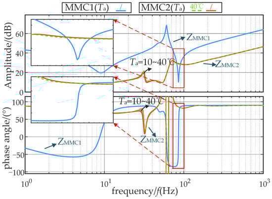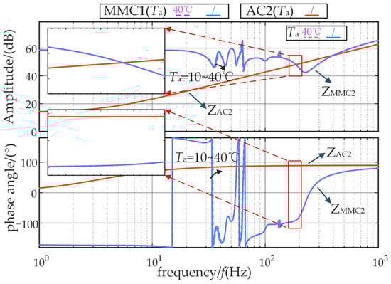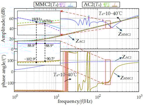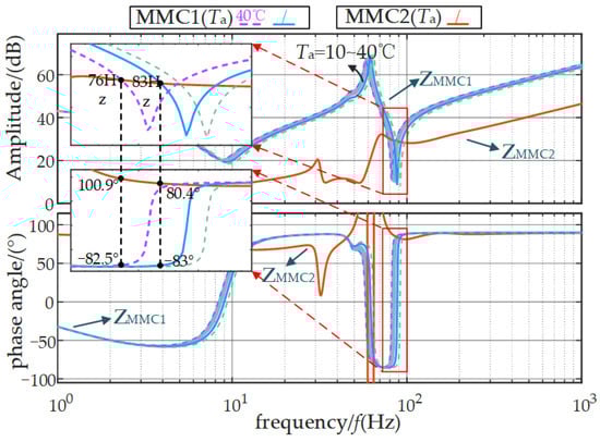 The resonant point frequency of MMC1’s actual DC side impedance decreases as the ambient temperature rises from 10 °C to 40 °C. This decrease in the resonant point causes the amplitude and phase of MMC1’s impedance to move leftward, thereby reducing the stability margin in the two-end MMC’s DC-side impedance interaction.