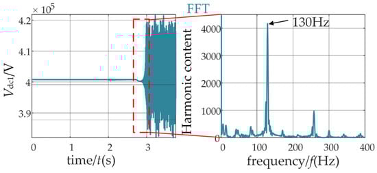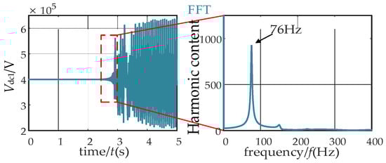 Figure 14 presents the simulation waveform and FFT analysis of the MMC1’s DC side voltage, conducted with an environmental parameter of 40 °C. At the specific timestamp of t1 = 2 s, the DC-side transmission line impedance is adjusted to reflect the prevailing environmental conditions. This adjustment is prompted by the system undergoing a negative damping effect. The FFT analysis of the waveform reveals a prominent 76 Hz harmonic component, corroborating the results obtained through theoretical analysis.