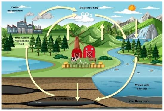 This section examines the architectural and engineering factors essential for the smooth integration of CCUS into current and upcoming infrastructures. Dwivedi and Gupta [25] investigate the effect of CO2 sequestration through accelerated carbonation curing on cement-lime’s properties, microstructure and phase structure. Stabilised soil mortar is used in a study using a lateritic soil with 42% clay and naturally sand 25% and 50% mass replacement, resulting in excess calcium silicate hydrate and calcium aluminate-hydrate. C-breakdown mortars display acceptable strength and reduced moisture sensitivity, representing the option of creating sustainable low-C building materials suitable for masonry application. Kazemian and Shafei [26] reviewed various C sequestration solutions for dropping the C footprint of concrete, confirming that carbonation curing is operational in C sequestration, where white cement displays high C capture capacity aggregate. Their findings suggest that a hybrid approach combining carbonation pretreatment seems promising for achieving sustainable performance. Figure 3 shows the natural C sequestration process, illustrating how atmospheric CO2 is absorbed by trees and integrated into soil and water ecosystems.