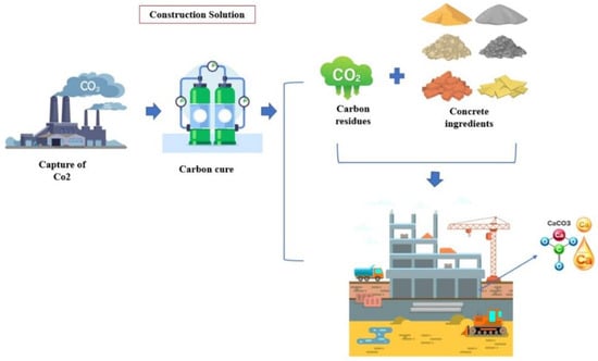 Carbon-infused concrete is a notable advancement in environmentally friendly building materials. It involves incorporating CO2 to harden concrete, improving its strength and durability. Cheng et al. [61] distinguished that transmission projects in northwestern China require cracking and fatigue resistance in concrete materials. Microcapsules with storage capacity were prepared using GO as a reinforcement. Simulation studies using ABAQUS revealed the microcapsule’s stress state and fracture behaviour. On-site tests showed the optimum ratio of GO, microcapsules, and water-cement mixtures. The results showed that the thickness of the microcapsule wall influenced the crack width and settleability of the concrete. GO increased the strength of the concrete, reduced its resistance, and compensated for the initial loss of strength. It is essential to control microcapsule size to aggregate size ratio to maintain the stability of concrete composites. Figure 4 demonstrates the application of captured CO2 in concrete carbonation, highlighting the cycle from CO2 capture to its use in construction materials.